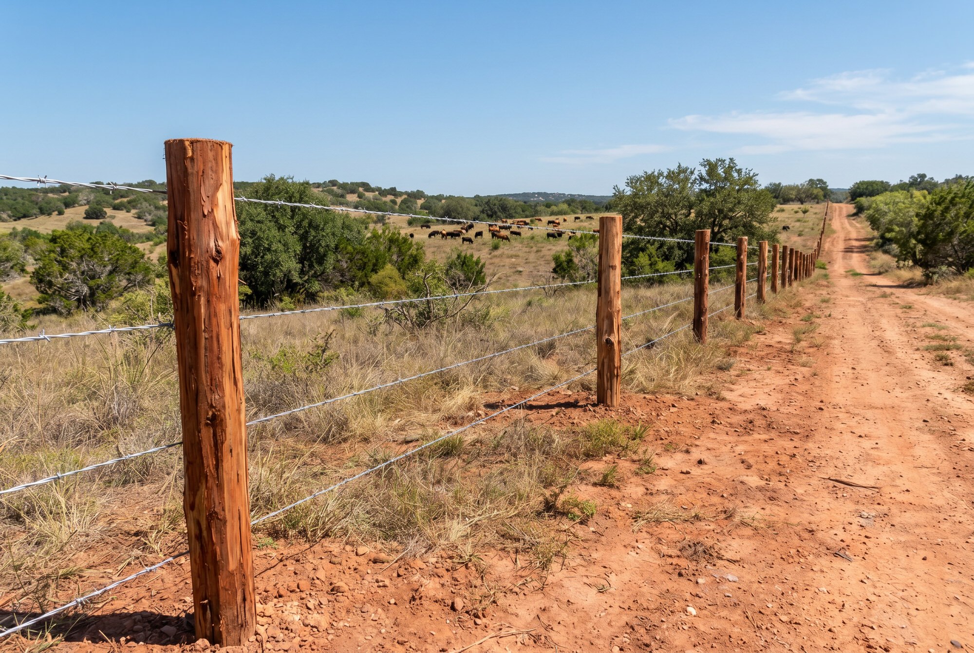 We typically install 12.5-gauge high-tensile barbed wire for most agricultural applications. High-tensile wire holds tension better over long fence lines and requires fewer line posts than traditional low-carbon wire, making it more economical for large properties.